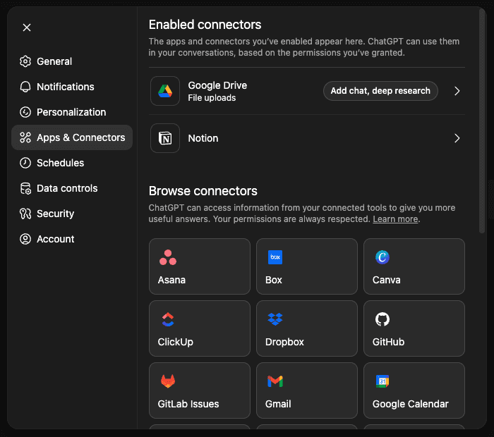 You'll see connectors for Gmail, Google Calendar, HubSpot, Canva, GitHub, Notion, and dozens more. Each connector displays which modes it supports—chat, deep research, agent, or some combination.