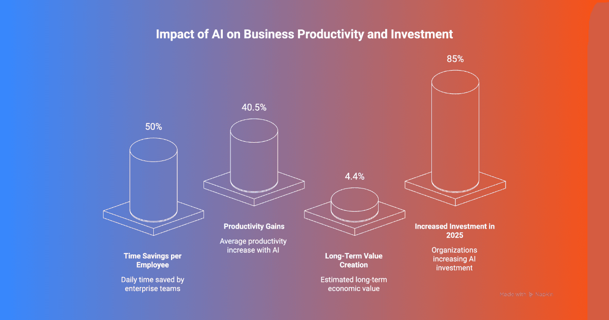 Businesses report 26 to 55% productivity gains when AI is embedded into core workflows. (Fullview)
