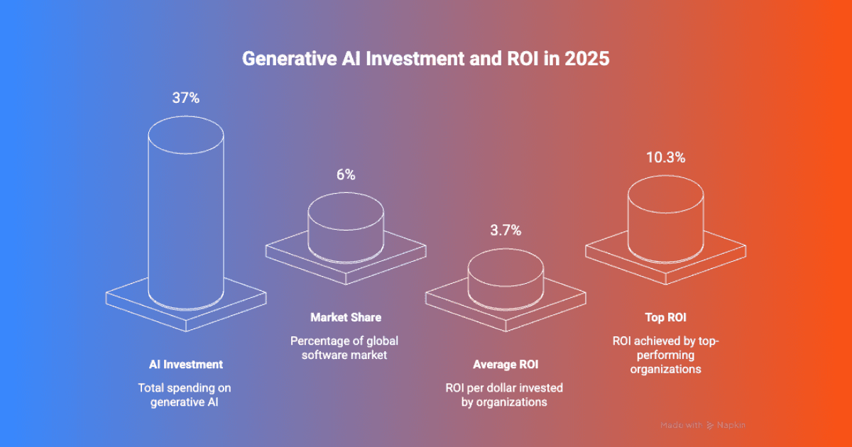 In 2025, companies spent approximately $37 billion on generative AI alone, representing a 3.2x increase from 2024. (Menlo Ventures)