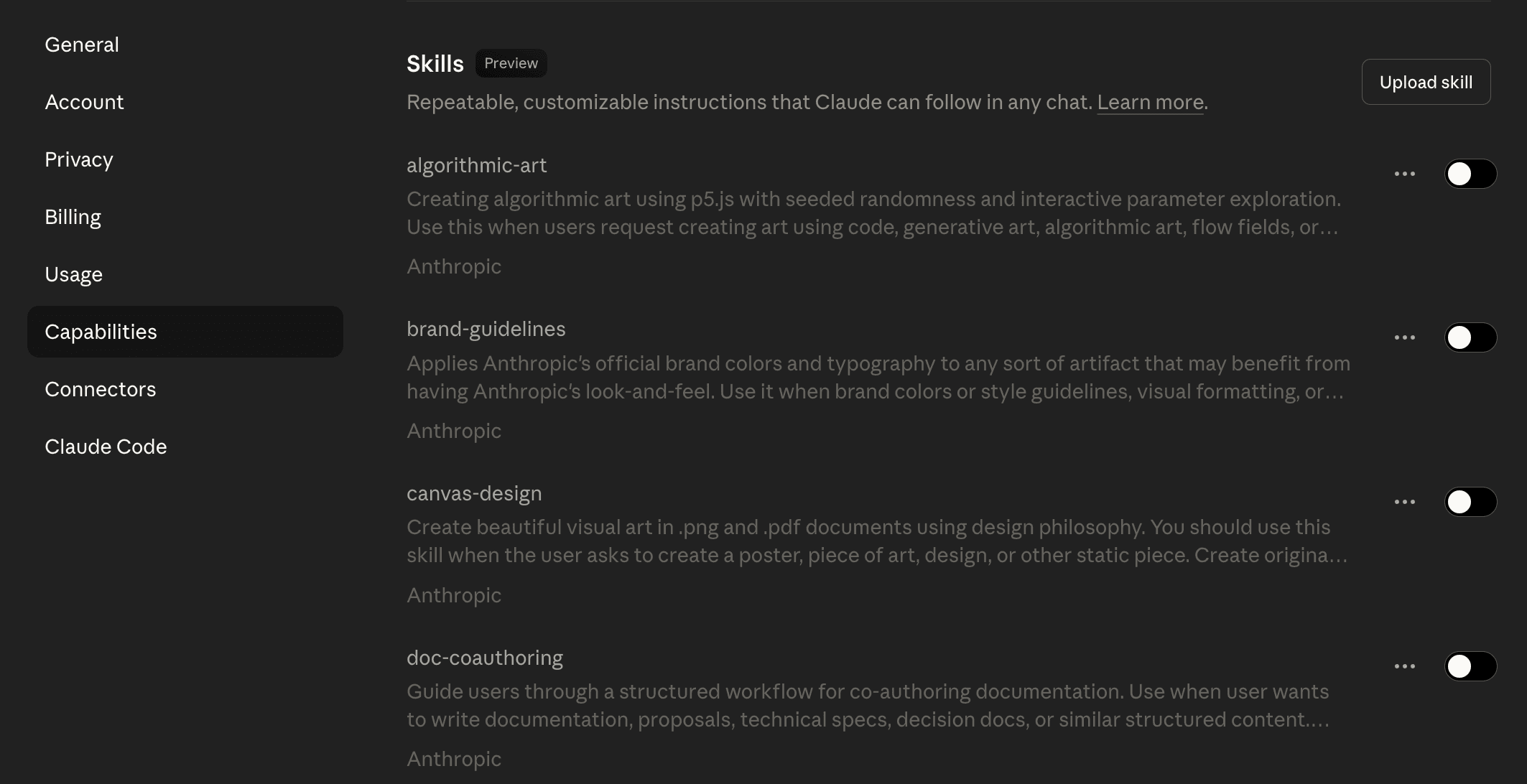 For example, instead of always mentioning your brand color scheme whenever you need a presentation, the Skill will already provide all the context Claude needs. You could have another skill with resources about your company. By bringing the two together, you get an on-brand presentation on features of your product with minimal effort and without having to develop long forgettable prompts.