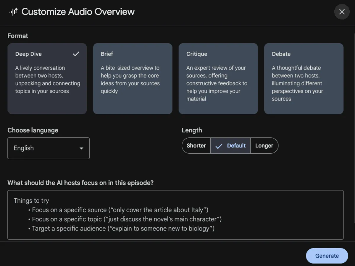 - Choose your preferred format (Deep Dive, Brief, Critique, or Debate)