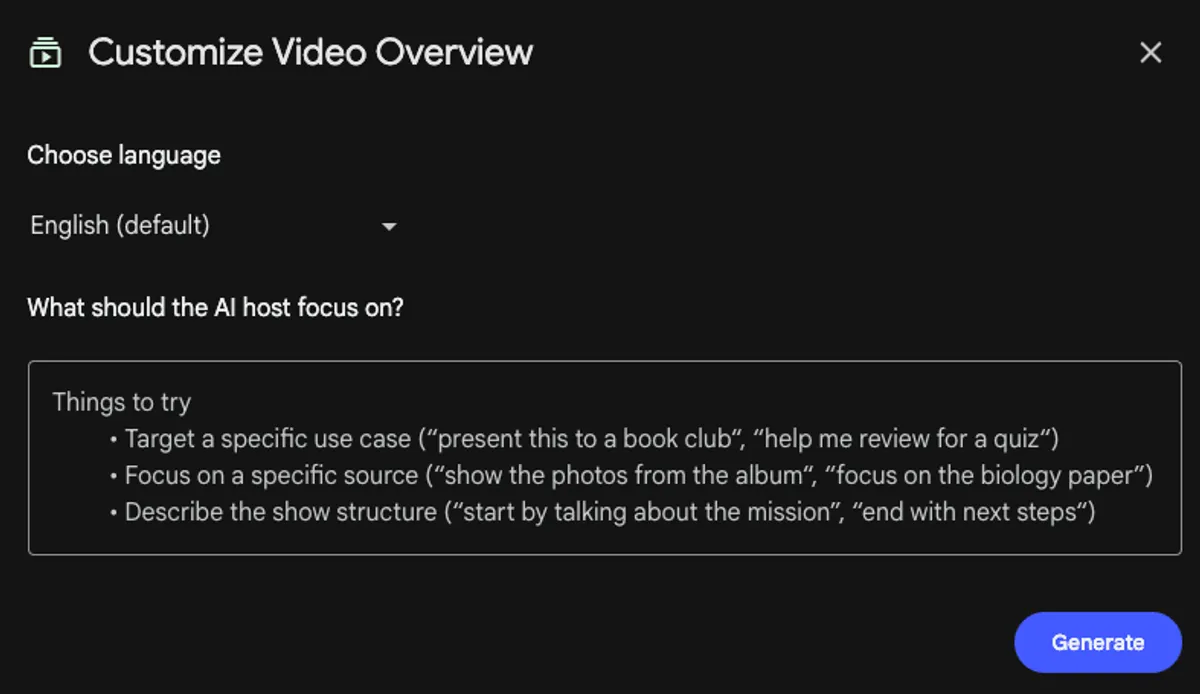 These videos can be used for training, presentations, or sharing insights with team members who prefer visual learning. The platform automatically creates relevant visuals based on your source material.