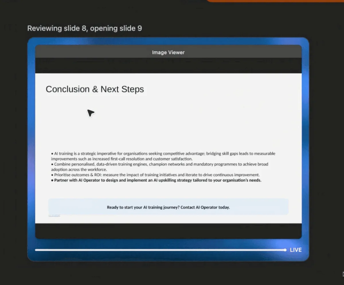 This is the kind of task that typically takes days—gathering sources, reading reports, extracting insights, formatting slides, and adding visuals.