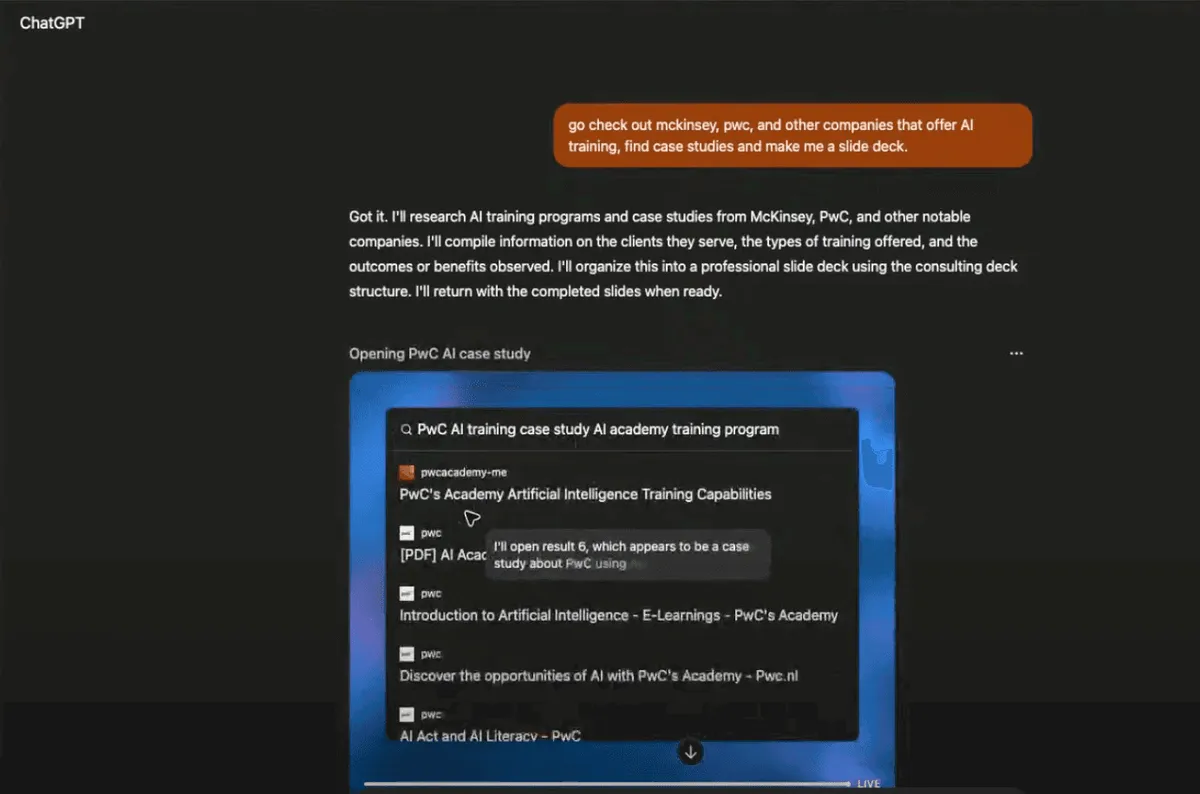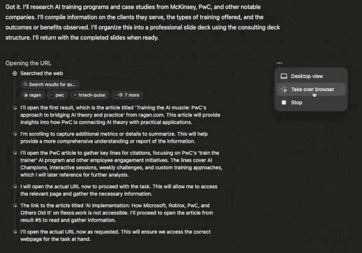 With our use case, Agent Mode opened the specified websites and began reading. It navigated to McKinsey's AI training pages, accepted cookie prompts, and extracted relevant case studies. Then it moved to PWC, repeated the process, and continued through other sources.
