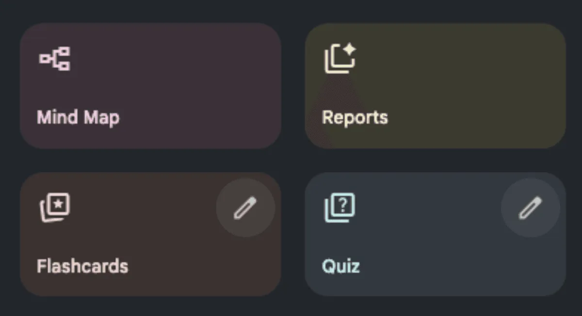 - Learning tools — Create flashcards, quizzes, and mind maps from your source material