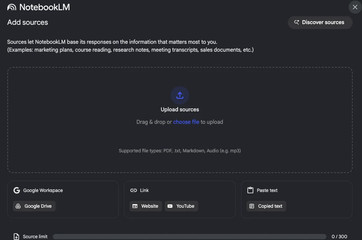 Start by building your knowledge base with multiple source types. NotebookLM accepts a wide variety of content formats: