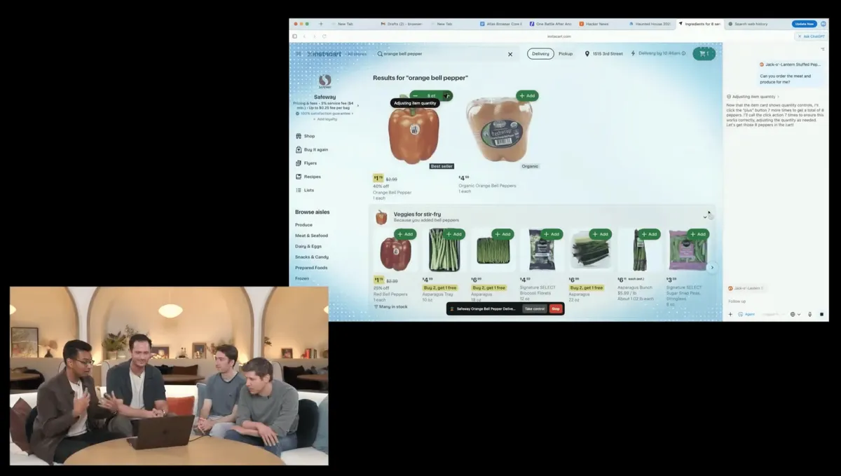 - Atlas opens Instacart, searches for each ingredient, and starts adding items