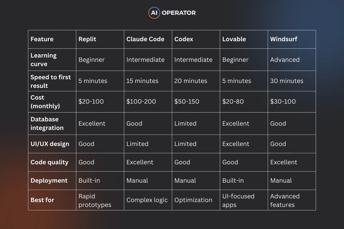 Each tool excels at different stages. Replit gets you from zero to working app fastest. Claude Code provides the smartest analysis and planning. GitHub connects everything. Codex handles parallel optimization tasks.